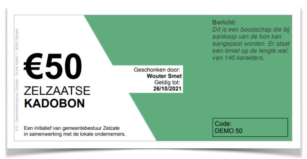 Een andere belangrijke troef van de Zelzaatse Kadobon is de personaliseerbaarheid. Naast een originele boodschap is het als bedrijf mogelijk het logo van je bedrijf kosteloos op de bon te plaatsen.